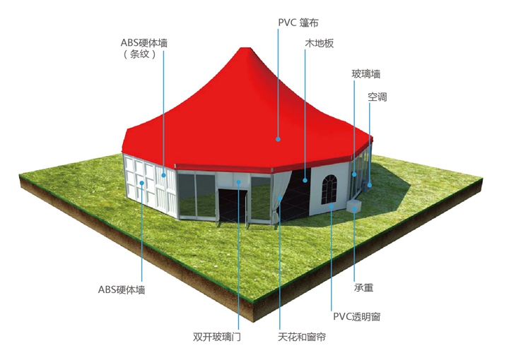 多邊形篷房有鉆石頂和尖頂兩種造型設計,尺寸規格從6m到50m,六邊形到十二邊形篷房,如六邊形篷房、八邊形篷房、十邊形篷房、十二邊形篷房、十六邊形篷房等。可用于派對、婚禮和盛大的宴會、戶外展覽會、戶外車展、戶外婚禮、路演、音樂會、時裝表演、會議、聚會和掛牌儀式等。