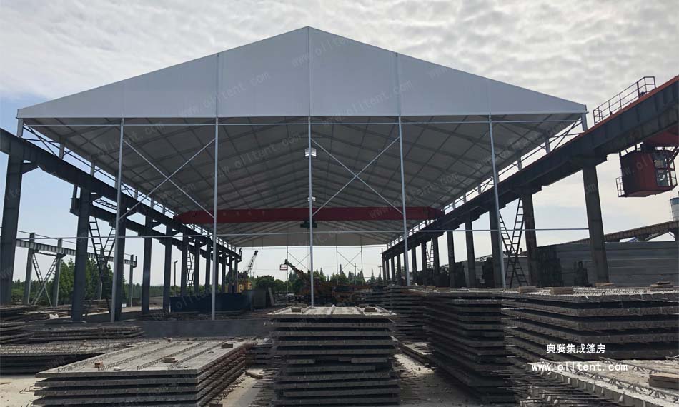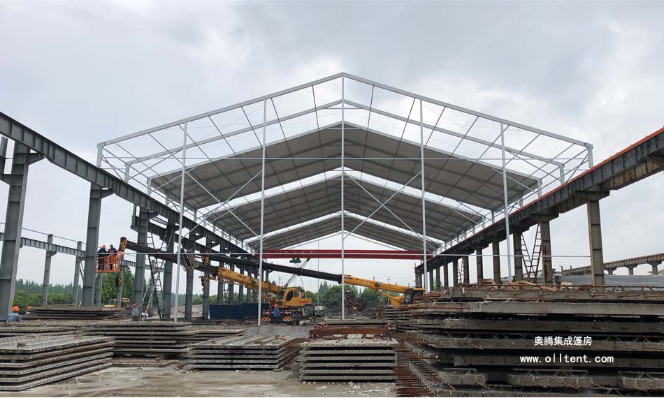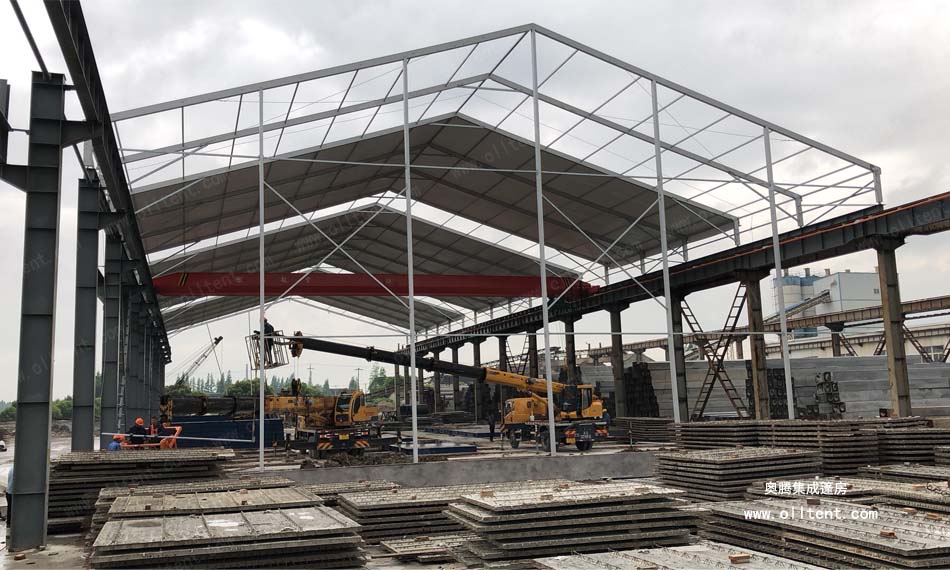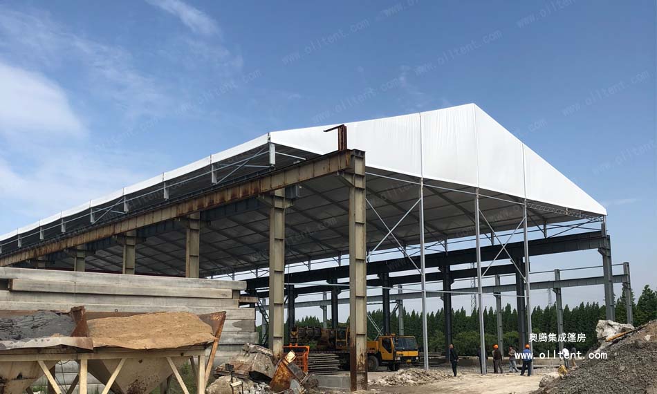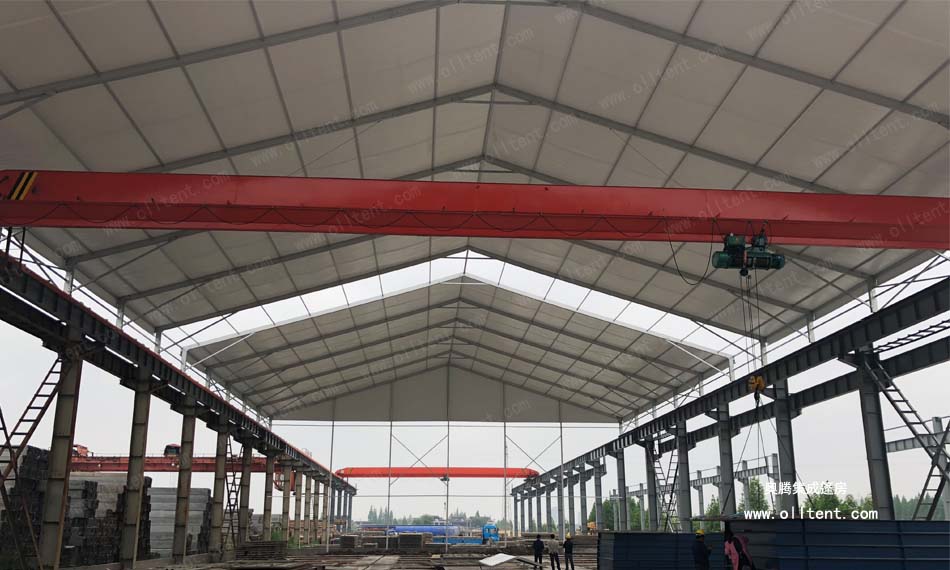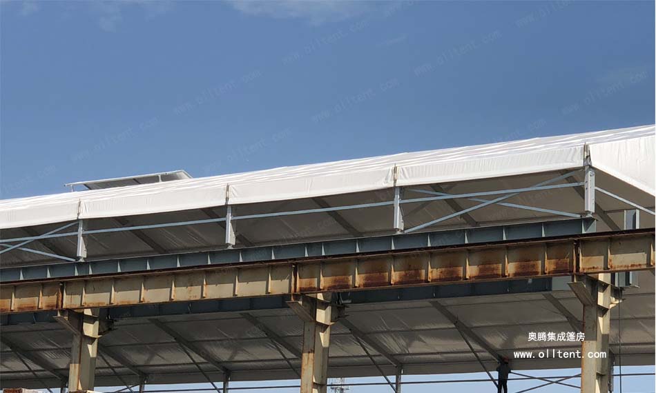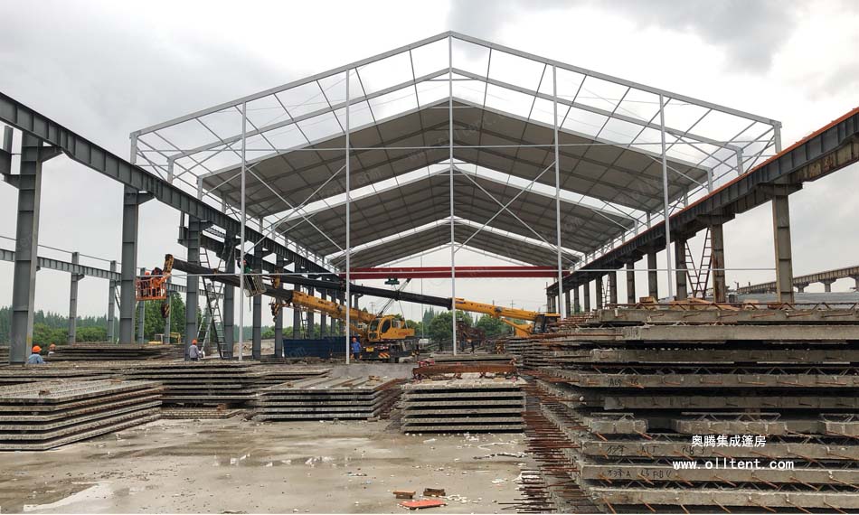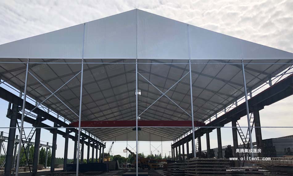 常熟賽順奇工業(yè)車間篷房搭建面積為4000平方米,施工時(shí)間是2018年3月,篷房規(guī)格為31米寬,130米長(zhǎng),邊高達(dá)到14米,搭建難度較高。篷房框架結(jié)構(gòu)采用工字鋼和鋁合金型材相結(jié)合,篷布采用850g/m2PVC涂層布,兩面白色。篷房?jī)?nèi)部安裝行車,頂部開啟透氣窗,可以在篷房?jī)?nèi)部進(jìn)行設(shè)備的裝卸作業(yè)。