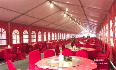 婚禮篷房租賃搭建地點靈活,海邊、草坪等都可以搭建。篷房的布置操控性也更大,篷布頂可以是紅白色的,可以是紅色或白色的,還可以是透明的,歐式的、田園風、中式等各種主題都可以在婚慶篷房里得以展現。
